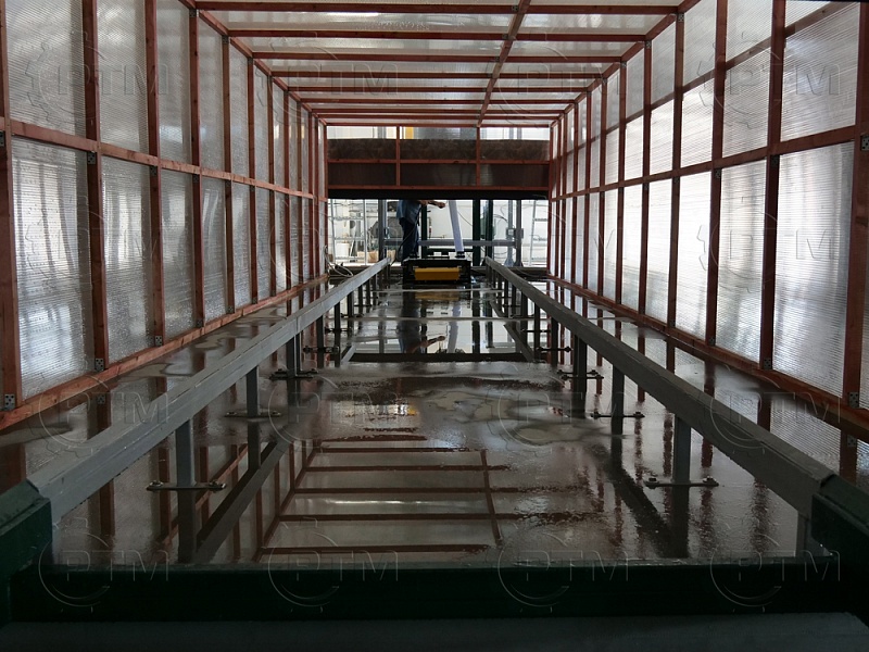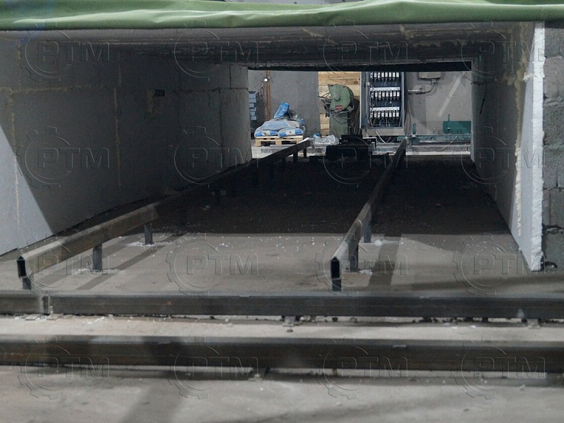 Данные рельсовые пути выполнены из профильной трубы, рельсовые пути на стойках используются для перемещение конвейерных оснований, рельсовые пути без стоек- это пути для перемещение передаточной тележки, с ее помощью конвейерные основания перемещают между камерами созревания и сушки массивов. Рельсовый путь крепится к бетонному основанию анкерами.