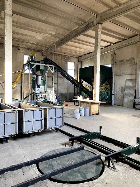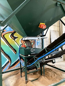 Ленточный конвейер с шевронной лентой для перемещения песка на газобетонном заводе. Шевронная лента с особым рисунком на поверхности обеспечивает лучшее сцепление и предотвращает соскальзывание материала во время перемещения.