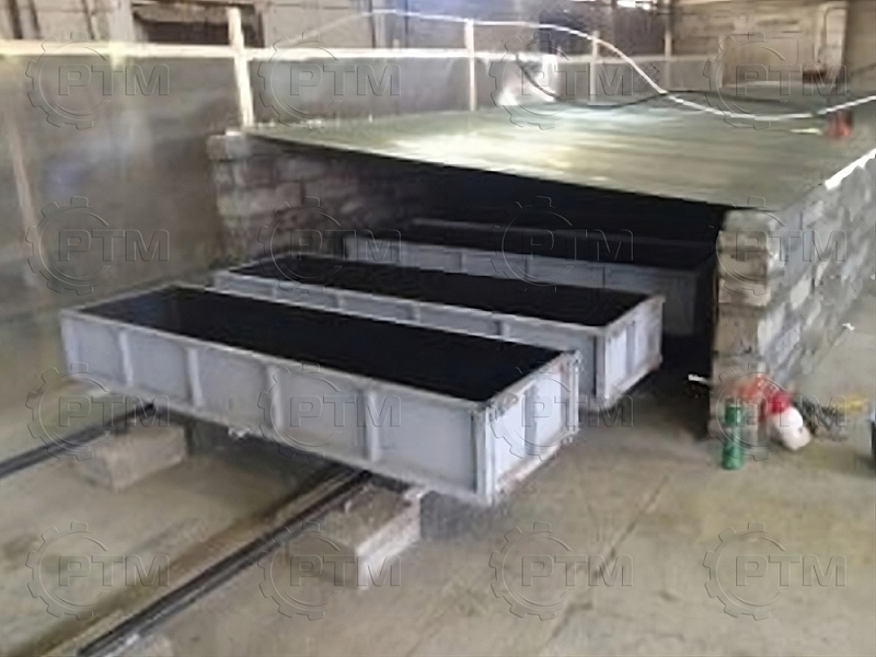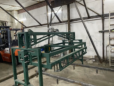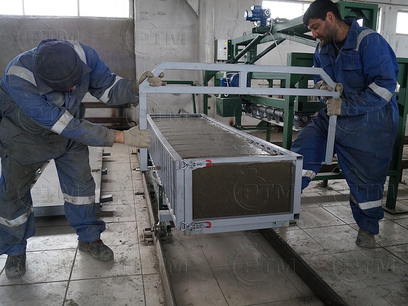 Транспортировка массива газобетона: Массив газобетона транспортируется по рельсовым путям с помощью электромеханического толкателя, из форм создается подобие поезда, одно основание толкает другое. Так происходит перемещение массива по заводу.