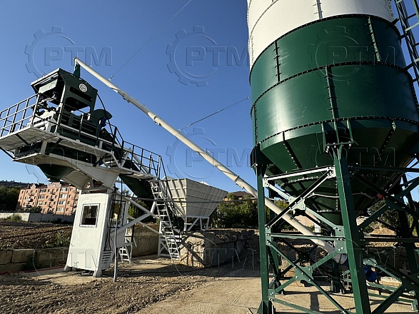 Данный завод производительность от 40 до 55 м3/час товарного бетона марки м200 или раствора. Объём загрузки бетоносмесителя 1200 литров, объем выгрузки готового бетона 800 литров. Один цикл не более 55 секунд. Время работы цикла регулируется оператором бетонного завода.