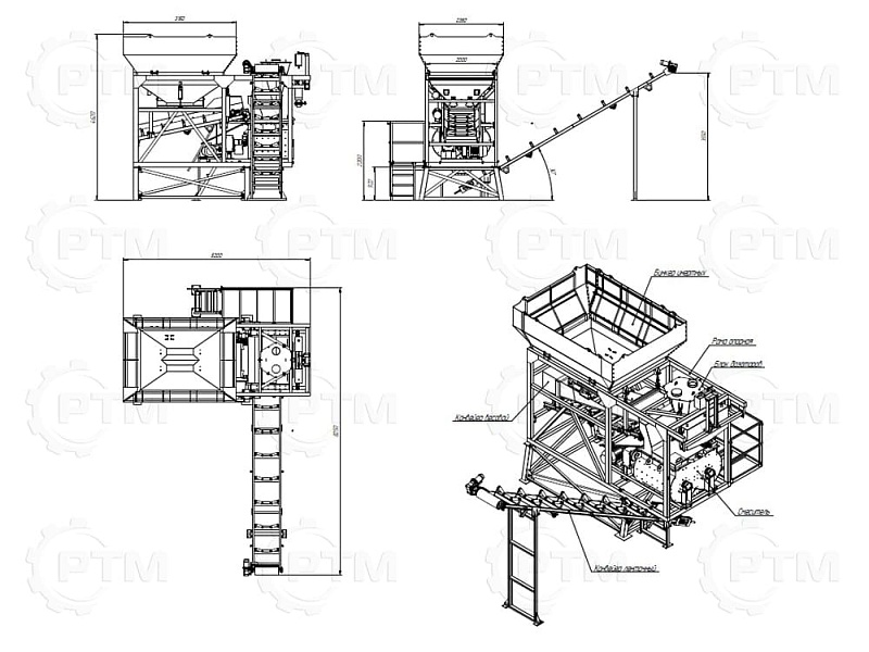1. Дозирующий комплекс МБ-8 (2 секции по 4 м3): состоит из двух до четырех бункеров для хранения инертных материалов (щебень, песок, отсев). На каждом бункере имеется два пневмо- затвора, необходимых для точной дозации материалов. При дозировании материалы попадают на весовой ленточный конвейер, весовые датчики фирмы CAS Ю.Корея, при наборе нужного количества материалов, заслонки закрываются, подача прекращается. Объем каждого бункера от 2,5 м3 до 20 м3, в зависимости от комплектации завода. Каждый бункер оснащен вибродвигателем MVE 300/3.