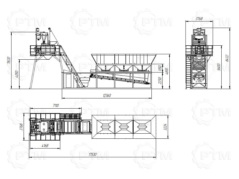 1. Дозирующий комплекс МБ-36 (2 секции по 12 м3): состоит из двух до четырех бункеров для хранения инертных материалов (щебень, песок, отсев). На каждом бункере имеется два пневмо- затвора, необходимых для точной дозации материалов. При дозировании материалы попадают на весовой ленточный конвейер, весовые датчики фирмы CAS Ю.Корея, при наборе нужного количества материалов, заслонки закрываются, подача прекращается. Объем каждого бункера от 2,5 м3 до 20 м3, в зависимости от комплектации завода. Каждый бункер оснащен вибродвигателем MVE 300/3.