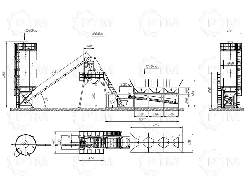 Данный завод производительность от 45 до 60 м3/час товарного бетона марки м200 или раствора. Объём загрузки бетоносмесителя 1500 литров, объем выгрузки готового бетона 1000 литров. Один цикл не более 55 секунд. Время работы цикла регулируется оператором бетонного завода.