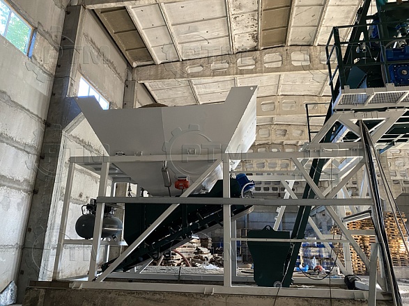 2. После набора нужного количества материалов инертные попадают в скиповый бак, далее скиповый бак поднимается и высыпает материалы в бетоносмеситель.