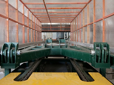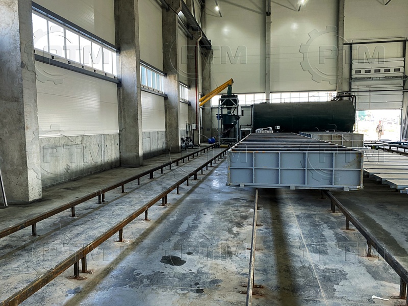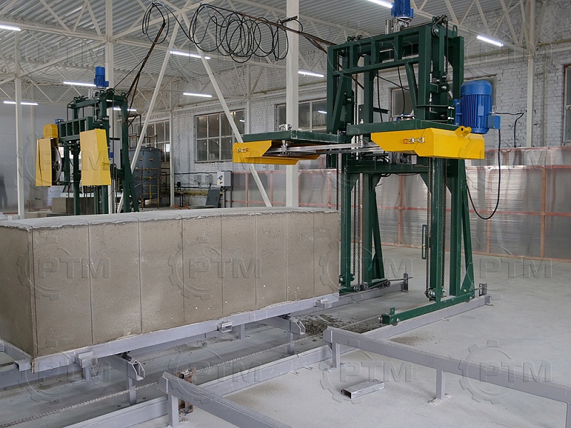 Транспортировка массива газобетона: Массив газобетона транспортируется по рельсовым путям с помощью электромеханического толкателя, из форм создается подобие поезда, одно основание толкает другое. Так происходит перемещение массива по заводу.