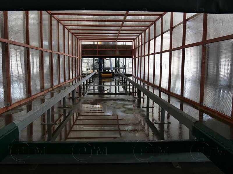 Транспортировка массива газобетона: Массив газобетона транспортируется по рельсовым путям с помощью электромеханического толкателя, из форм создается подобие поезда, одно основание толкает другое. Так происходит перемещение массива по заводу.