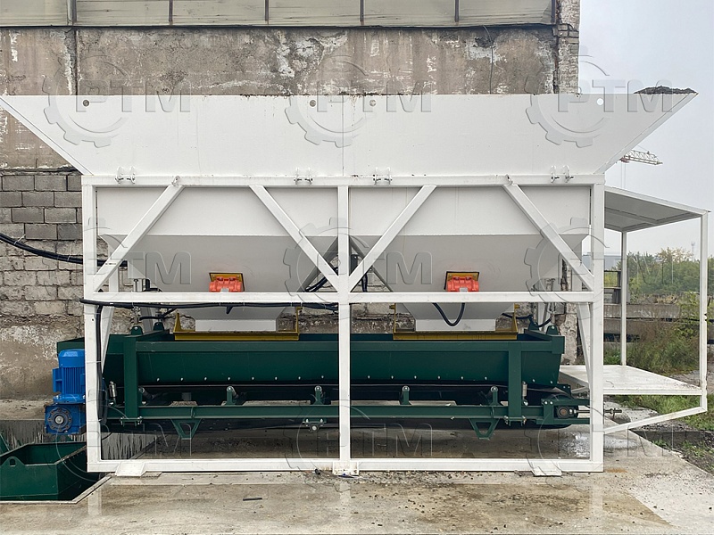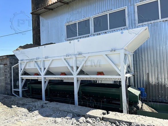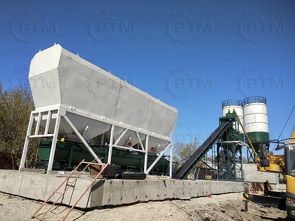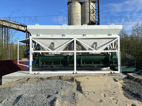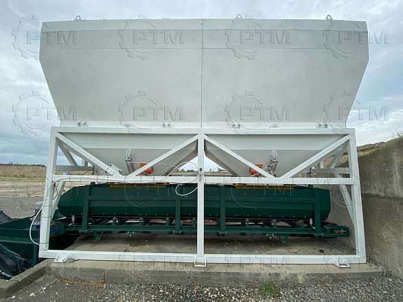 1.     Дозирующий комплекс СТ-20 (2 секции по 10 м3): состоит из двух до четырех бункеров для хранения инертных материалов (щебень, песок, отсев). На каждом бункере имеется два пневмо- затвора, необходимых для точной дозации материалов. При дозировании материалы попадают на весовой ленточный конвейер, весовые датчики фирмы CAS Ю.Корея, при наборе нужного количества материалов, заслонки закрываются, подача прекращается. Объем каждого бункера от 2,5 м3 до 20 м3, в зависимости от комплектации завода. Каждый бункер оснащен вибродвигателем MVE 300/3.